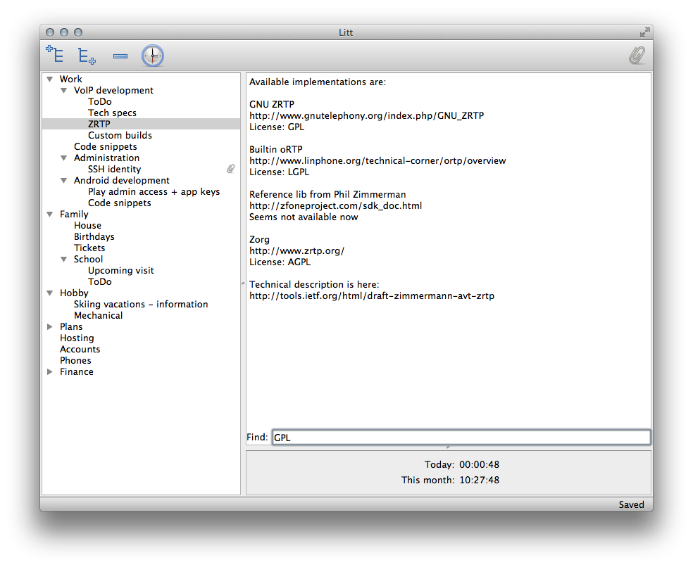 Litt is little idea & time tracker. It combines functionality of outliner & time tracker in single application.